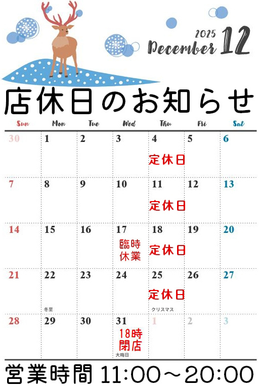 12月の店休日のお知らせです。