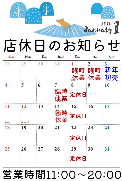 遅くなり申し訳ございませんが1月の店休日のお知らせです。