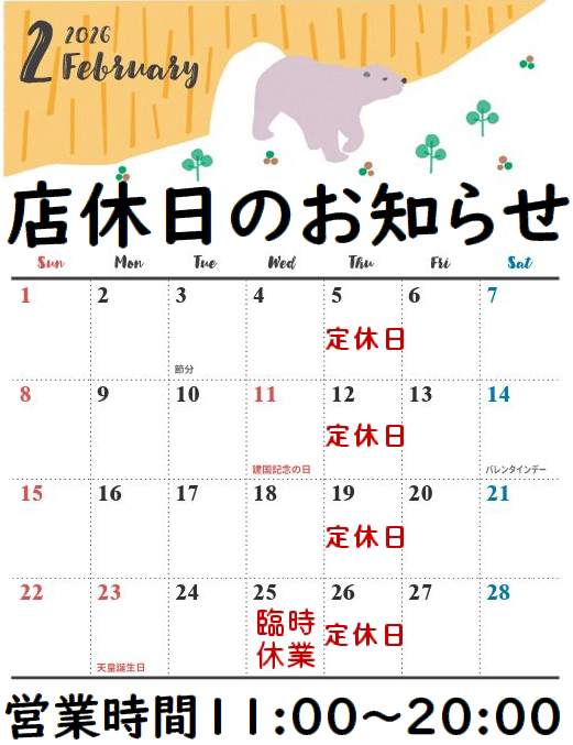 遅くなり申し訳ございませんが2月の店休日のお知らせです。
